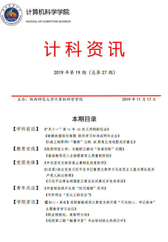 《计科资讯》是万象城娱乐awc线路编辑整理的电子资讯,信息来源为《光明日报》《人民日报》《中国青年报》等权威纸媒,编辑工作由学院优秀本科生党员、团员承担。《计科资讯》主要包括学科前沿、教育在线、党团先锋、青年关注及学院资讯五个版块。学院师生可以从中了解到专业前沿和国家时政大事,欢迎大家下载阅读。