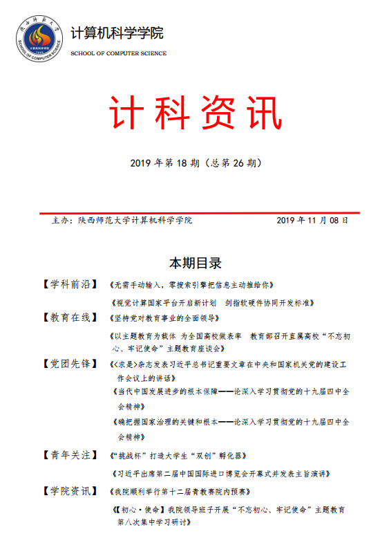 《计科资讯》是万象城娱乐awc线路编辑整理的电子资讯,信息来源为《光明日报》《人民日报》《中国青年报》等权威纸媒,编辑工作由学院优秀本科生党员、团员承担。《计科资讯》主要包括学科前沿、教育在线、党团先锋、青年关注及学院资讯五个版块。学院师生可以从中了解到专业前沿和国家时政大事,欢迎大家下载阅读。