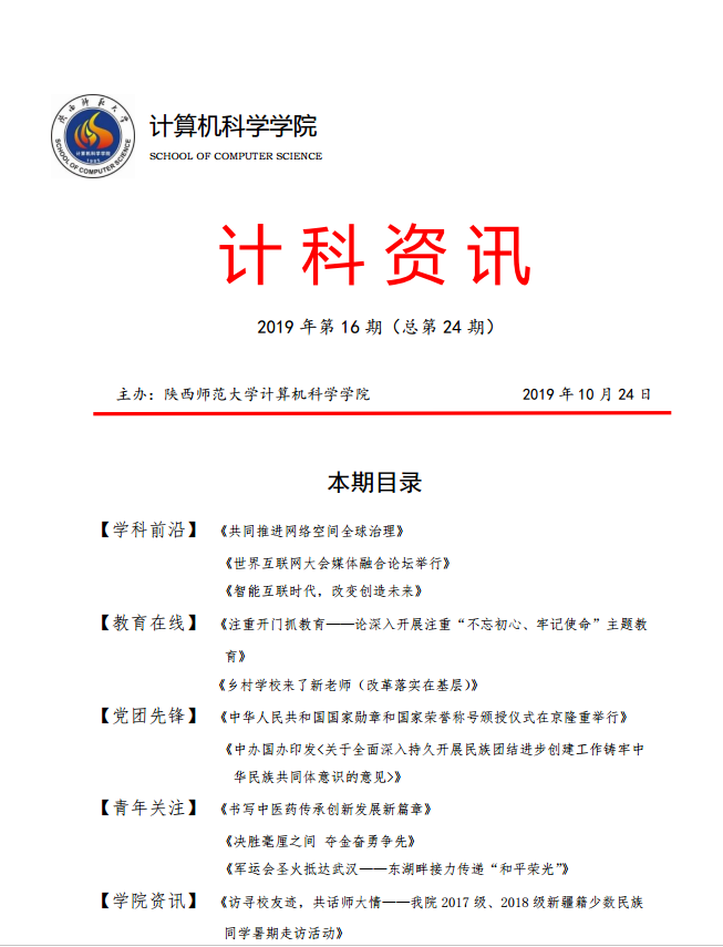 《计科资讯》是万象城娱乐awc线路编辑整理的电子资讯,信息来源为《光明日报》《人民日报》《中国青年报》等权威纸媒,编辑工作由学院优秀本科生党员、团员承担。《计科资讯》主要包括学科前沿、教育在线、党团先锋、青年关注及学院资讯五个版块。学院师生可以从中了解到专业前沿和国家时政大事,欢迎大家下载阅读。
