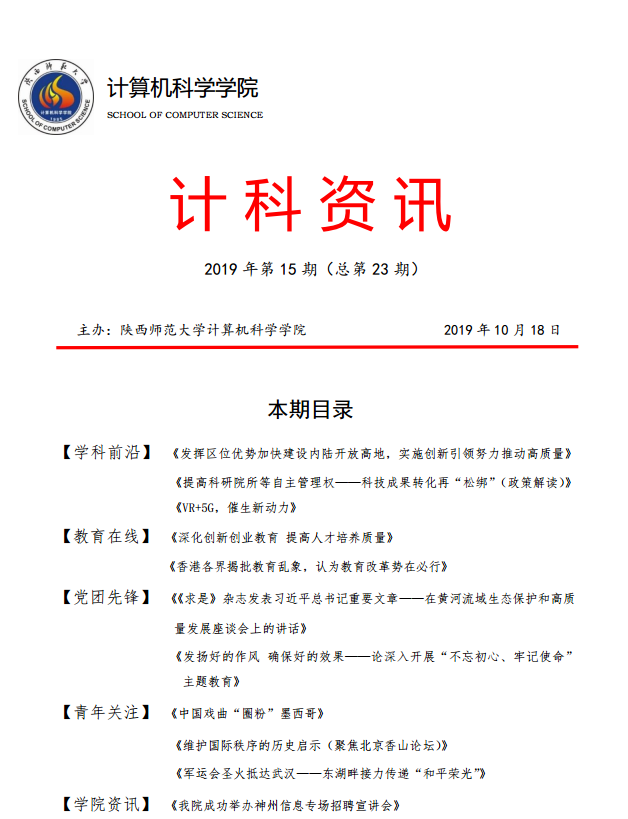 《计科资讯》是万象城娱乐awc线路编辑整理的电子资讯,信息来源为《光明日报》《人民日报》《中国青年报》等权威纸媒,编辑工作由学院优秀本科生党员、团员承担。《计科资讯》主要包括学科前沿、教育在线、党团先锋、青年关注及学院资讯五个版块。学院师生可以从中了解到专业前沿和国家时政大事,欢迎大家下载阅读。
