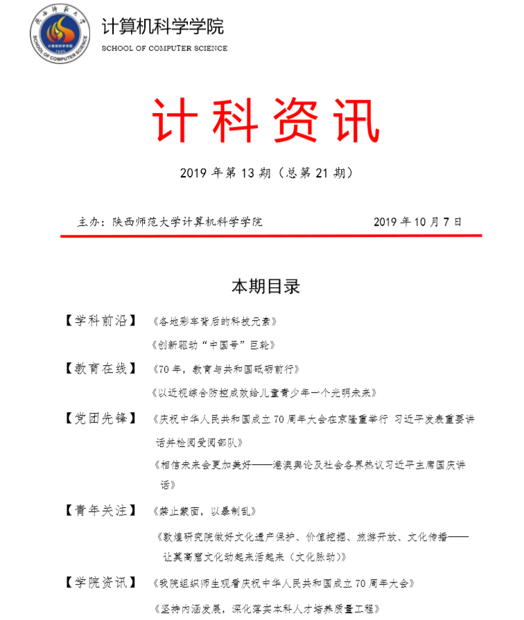 《计科资讯》是万象城娱乐awc线路编辑整理的电子资讯,信息来源为《光明日报》《人民日报》《中国青年报》等权威纸媒,编辑工作由学院优秀本科生党员、团员承担。《计科资讯》主要包括学科前沿、教育在线、党团先锋、青年关注及学院资讯五个版块。学院师生可以从中了解到专业前沿和国家时政大事,欢迎大家下载阅读。