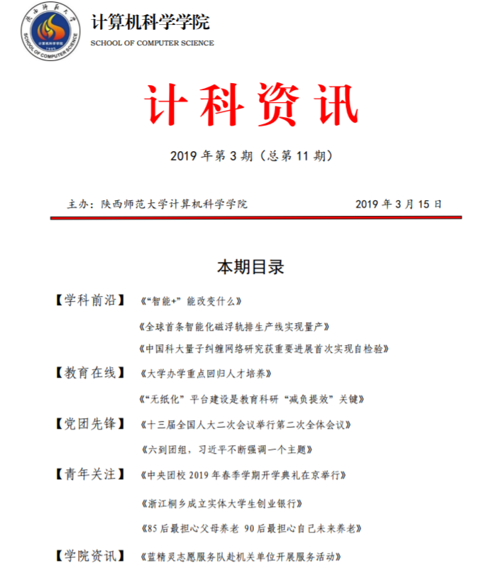 《计科资讯》是万象城娱乐awc线路编辑整理的电子资讯,信息来源为《光明日报》《人民日报》《中国青年报》等权威纸媒,编辑工作由学院优秀本科生党员、团员承担。《计科资讯》主要包括学科前沿、教育在线、党团先锋、青年关注及学院资讯五个版块。学院师生可以从中了解到专业前沿和国家时政大事,欢迎大家下载阅读。