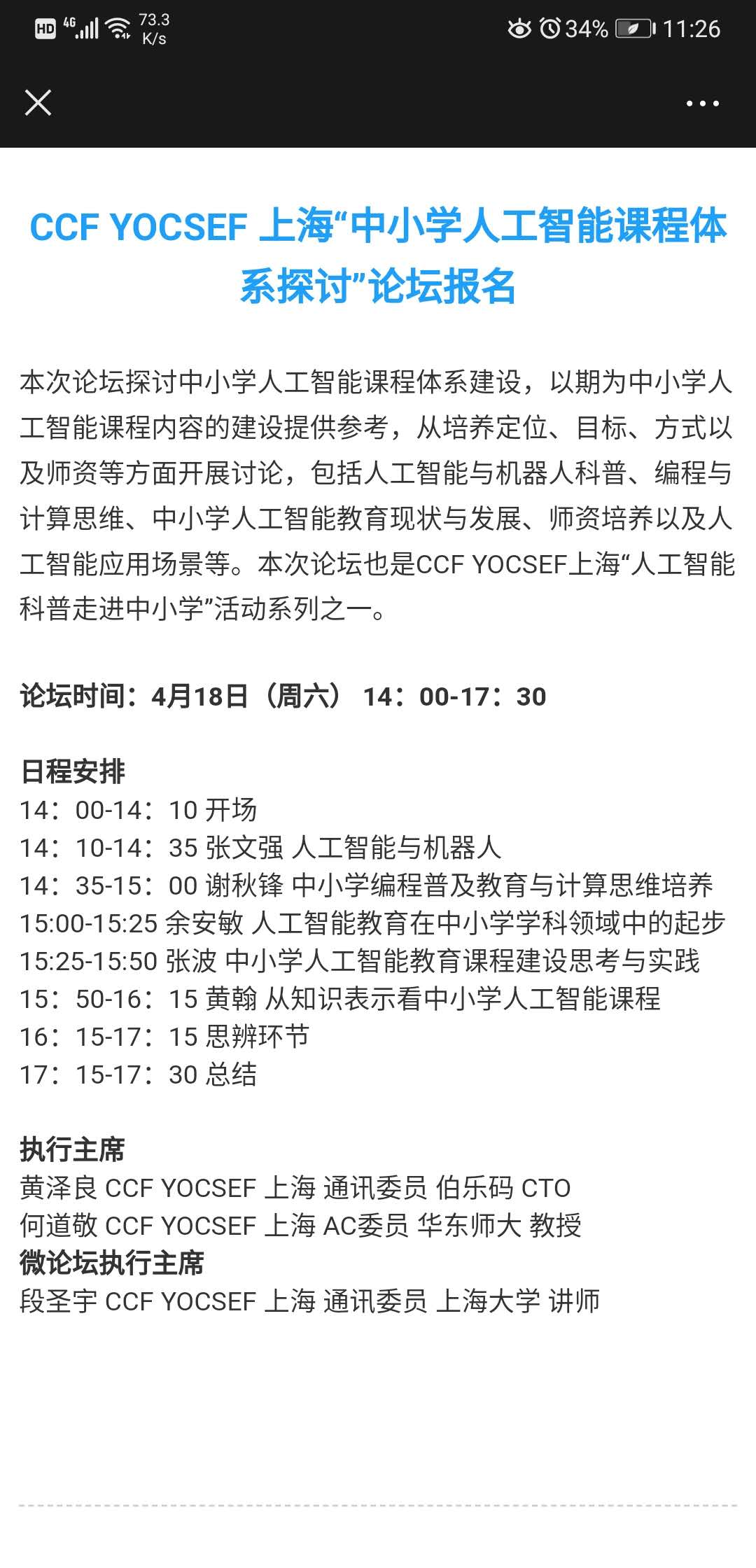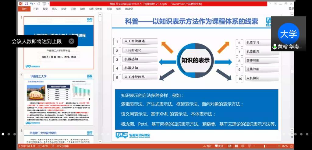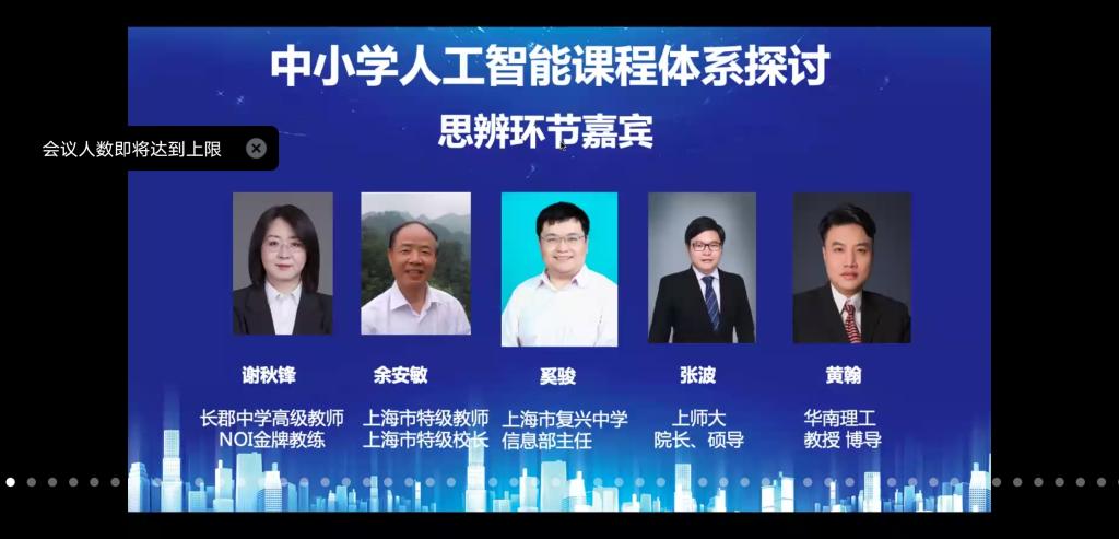 2020年4月18日,由中国计算机学会青年计算机科技论坛主办的“中国中小学人工智能课程体系研讨”会议通过网络在线举行。该会议主要探讨中小学人工智能课程体系建设、培养定位、师资培训、机器人科普、编程与计算思维培养等问题。在会议上作报告的有复旦大学智能机器人研究院副院长张文强教授、CCF杰出演讲者、中学高级教师谢秋锋老师等多位从事人工智能研究与人工智能基础教育的专家学者。万象城官网组织人工智能与教育信息技术科研团队、人工智能本科课程团队参加了该会议。通过与参会专家的交流,进一步明确了万象城官网面向教育教学的人工智能科研特色以及涵盖中小学教育的人工智能专业办学特色。