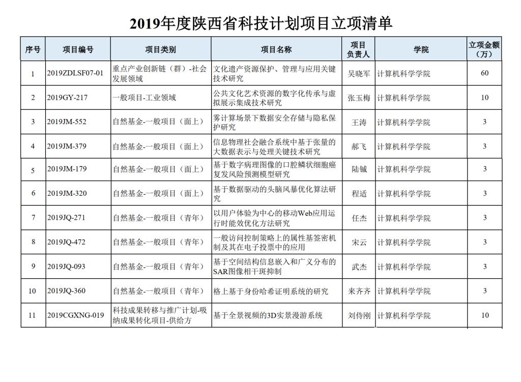 近日,陕西省科学技术厅公布了2019年陕西省科技计划项目资助结果,万象城官网11项项目获得项目资助,其中,点产业创新链(群)项目1项,工业领域项目1项,自然科学基础研究计划项目-面上项目4项,自然科学基础研究计划项目-青年基金4项,科技成果转移与推广计划-吸纳成果转化项目1项,立项经费104万元,立项经费总数位居全校第三。