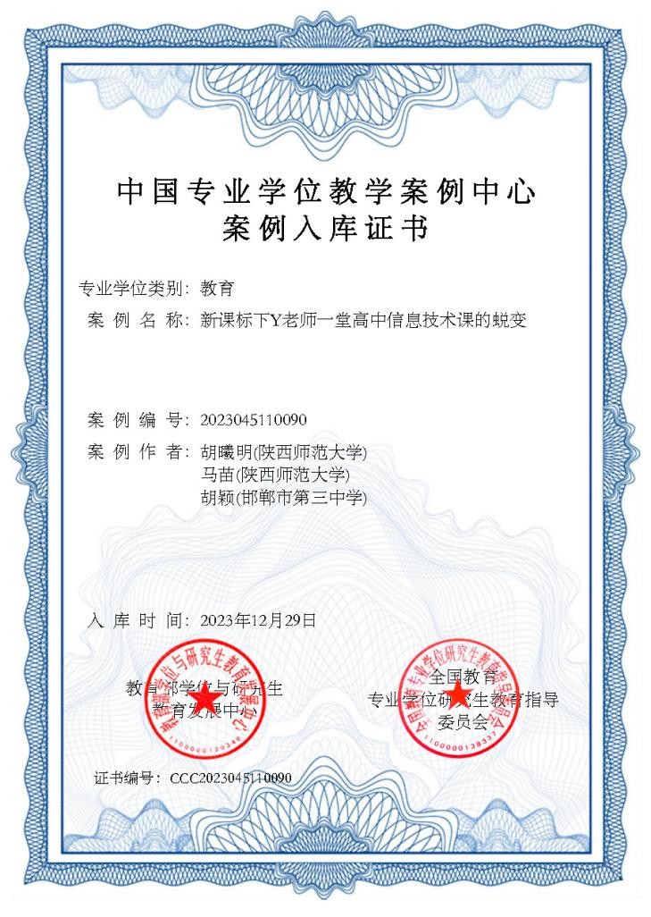 近日,全国教育专业学位研究生教指委发布《关于公布第五届教育专业学位教学案例征集工作评审结果的通知》,万象城官网胡曦明、马苗联合邯郸市第三中学胡颖开发的“新课标下Y老师一堂高中信息技术课的蜕变”教学案例入选中国专业学位教学案例中心案例库。这是万象城官网专业学位教学案例首次入国家级教学案例库。