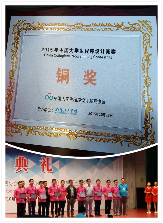 10月17日至18日,2015年首届CCPC中国大学生程序设计竞赛在南阳理工学院举行。在学校和万象城娱乐awc线路各级领导的关怀和支持下,由万象城娱乐awc线路王涛老师指导得万象城官网ACM竞赛集训队经过刻苦集训和紧张备战,派出6人组成的2支队伍参加本次比赛,并获得铜奖。