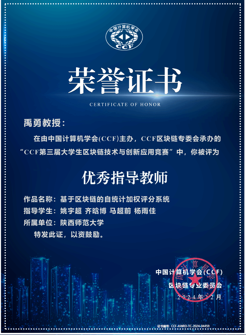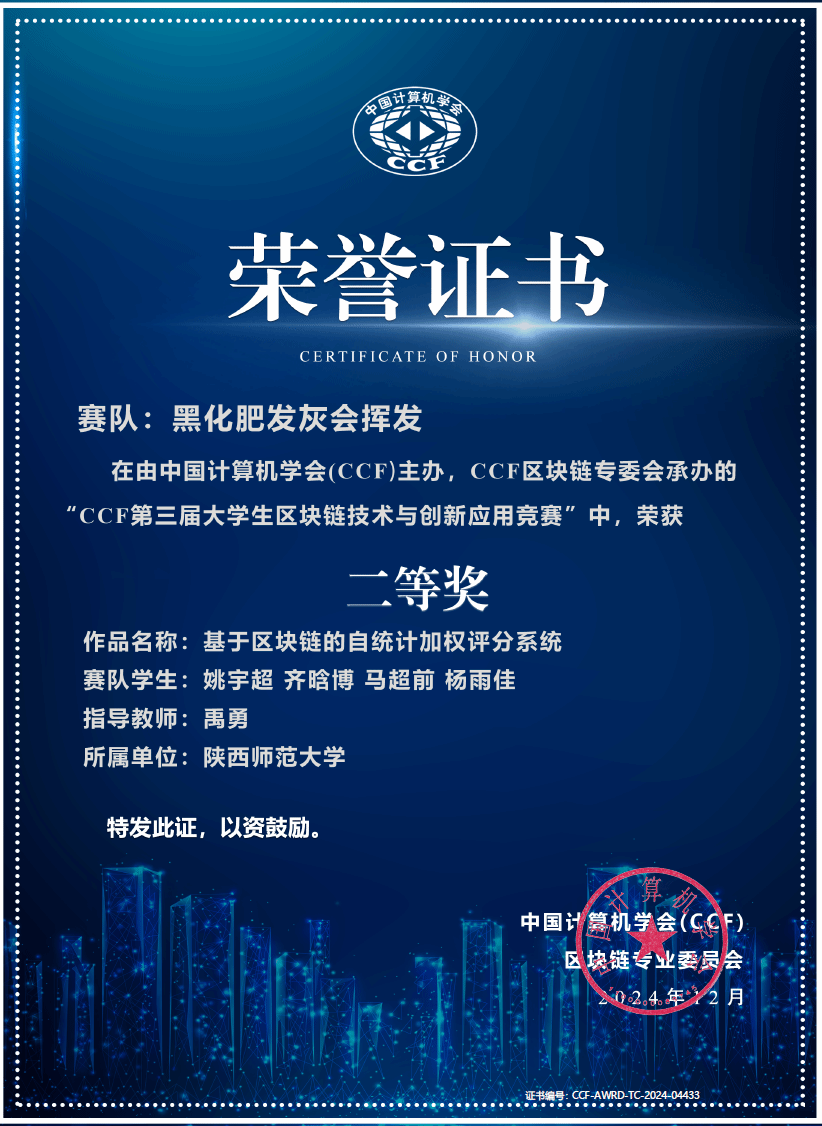 近日,中国计算机学会公布了“第三届CCF区块链技术与创新应用竞赛”决赛成绩。本次竞赛吸引了来自全国各大高校和企业的260支团队参与,经过激烈角逐,由万象城官网禹勇教授指导,姚宇超、齐晗博、马超前、杨雨佳组成的团队,凭借其创新作品“基于区块链的自统计加权评分系统”成功晋级决赛。在决赛的现场答辩、作品展示及专家评审环节中,团队成员凭借扎实的专业知识、创新的技术方案以及出色的团队协作能力,赢得了评委的一致好评,最终荣获二等奖,禹勇教授被评为优秀指导教师。