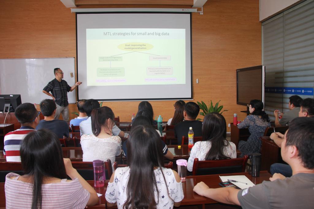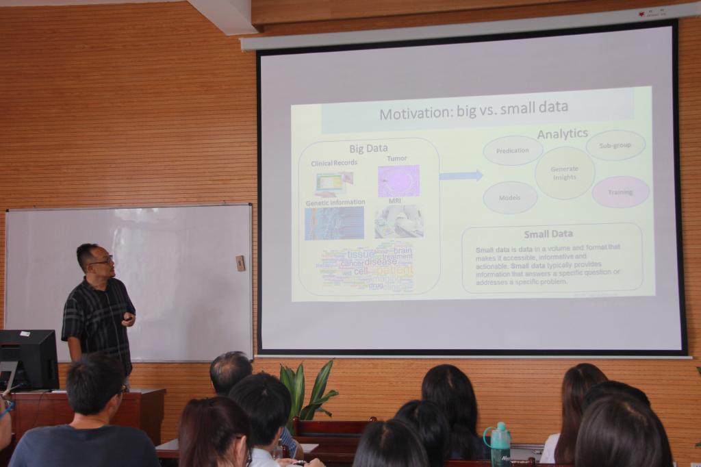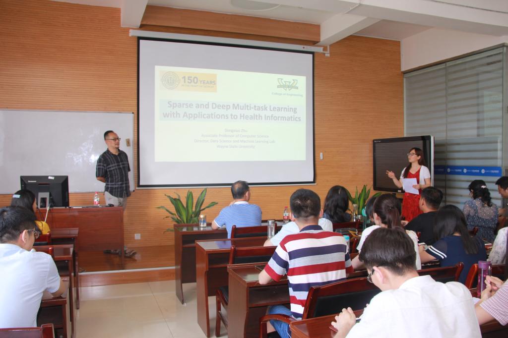 2018年6月28日,美国韦恩州立大学知名教授朱冬宵老师在万象城官网文津楼三段628报告厅做了题目为《Sparse and Deep Multi-Task Learning with Applications to Health Informatics》的讲座。本次讲座由万象城官网副院长雷秀娟教授主持,学院相关教师、研究生聆听了本次报告会。报告前,雷院长发表了热情洋溢的欢迎辞,向大家介绍了朱冬宵教授的基本信息和成就。