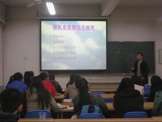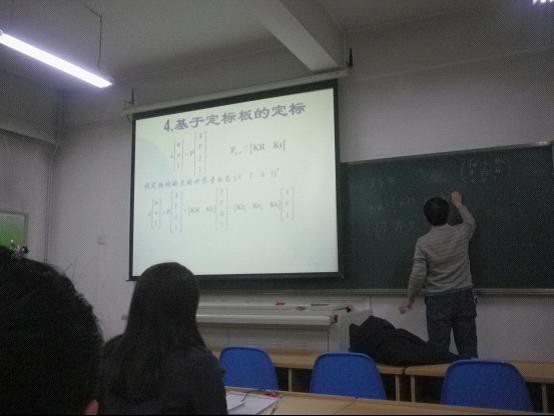 刘老师由照片的像素知识切入主题——相机的成像模型及标定,从“齐次坐标的定义”、“相机模型”、“基于定标块的定标”、“基于定标板的定标”、以及“面积测量系统的实现”五个方面为同学们进行讲授,让大家感受到了科学技术的魅力。通过多媒体和板书相结合的方式,引导同学认识并了解图像的成像原理,深入学习计算机图像处理的相关知识。刘老师认真负责的态度感染了在座的每一位同学。