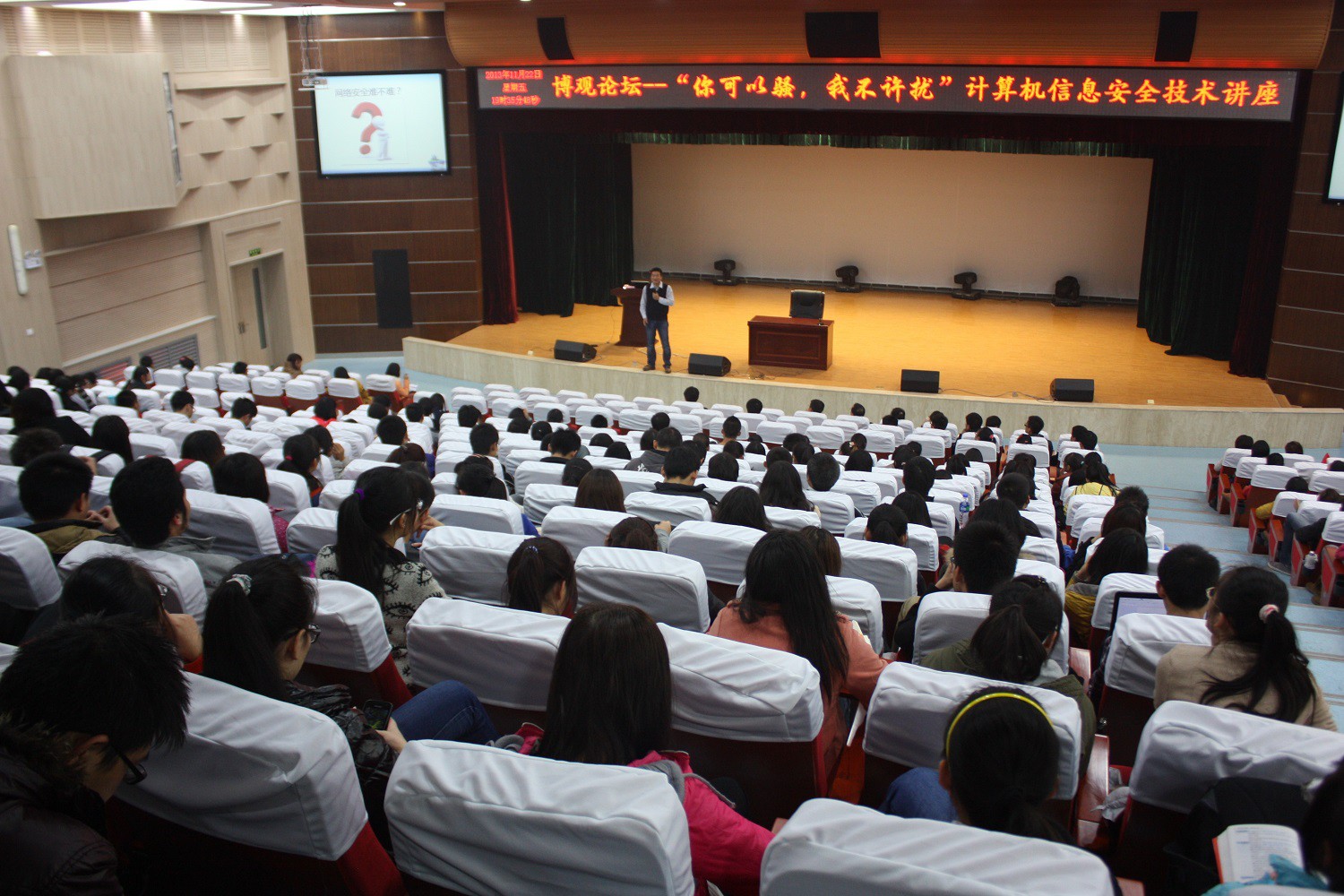 2013年11月22日,由万象城娱乐awc线路主办的博观论坛之计算机信息安全技术大家谈活动在新勇活动中心二层学生剧场举办。讲座邀请了西安电子科技大学电子工程学院胡建伟副教授,北京红亚华语科技有限公司总经理郑洪宾,技术部经理任永程为主讲嘉宾,出席活动的还有万象城娱乐awc线路副院长吴振强教授,学院党委副书记袁冰老师,团委书记胡雯洁老师。