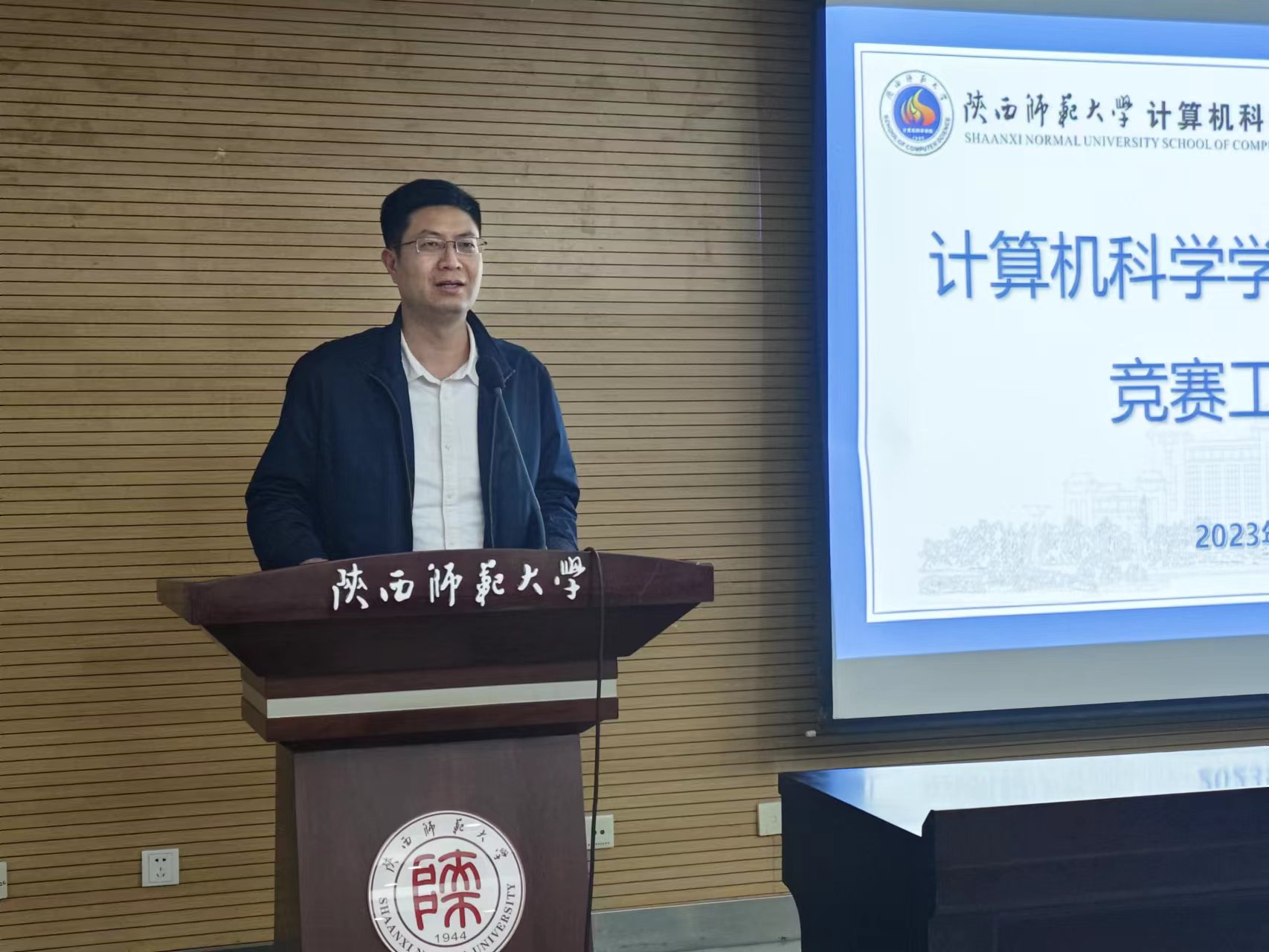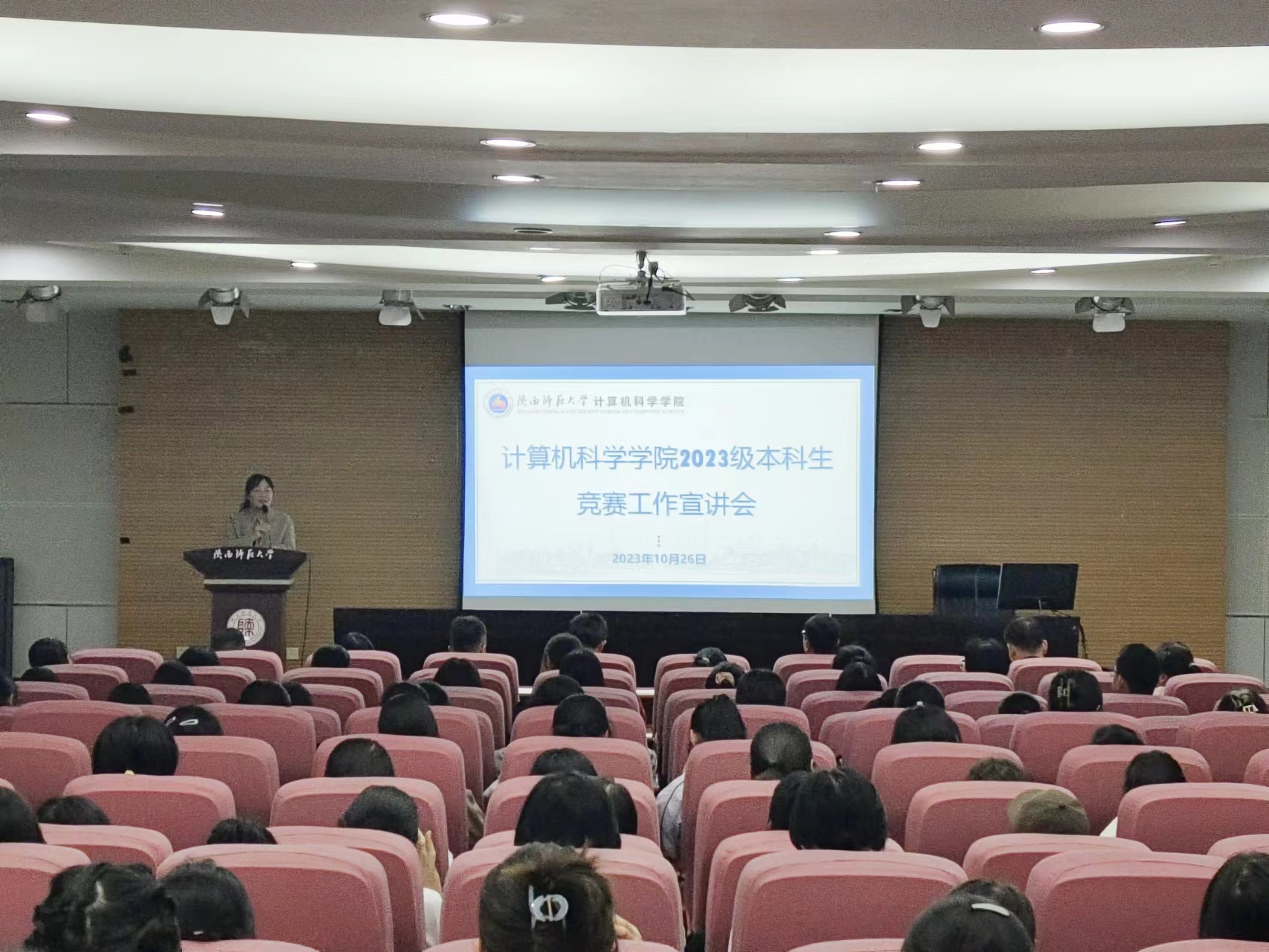10月26日晚,万象城官网在雁塔校区崇鋈楼三层归仁堂举办2023级本科生竞赛工作宣讲会。学院副院长李鹏、学院党委副书记郭康凌,学院竞赛工作组指导教师王涛、张玉梅、武杰、杨楷芳、雷鸣、罗宇,2023级辅导员梁星宇以及学院2023级学生代表200余人到场参会。宣讲会由郭康凌主持。