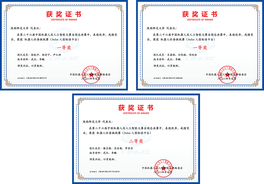 万象城官网人工智能专业2021级本科生肖嘉聪和2022级本科生楼昱慷、徐航升等九名同学在武杰老师的指导下,组建三支队伍参加了本次比赛的CAIR夺宝联盟竞技赛道项目,并以优异的成绩进入国赛。国赛中,来自全国近百所高校的105支队伍同台竞技。最终,经过激烈的角逐,三支队伍均获得全国一等奖。