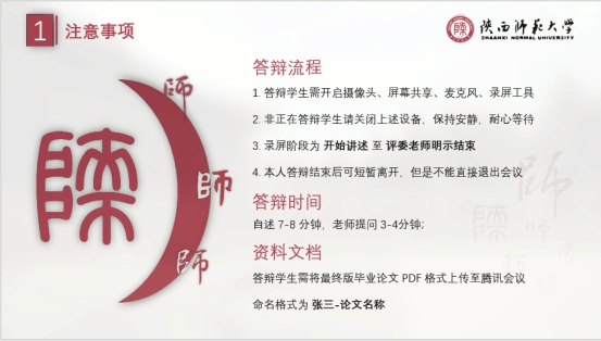 答辩工作于下午两点半正式开始,答辩人提前进入会议并将自己的毕业论文上传到腾讯会议的文档中,并逐一进行答辩自述,依次通过屏幕共享对自己论文的选题目标,研究过程,理论分析及实际意义展开描述,节奏紧凑,秩序井然。答辩小组认真听讲,仔细查阅答辩论文,对学生存在的问题提出修改意见。评委们强调的问题有论文格式、PPT制作中细节的错误以及一些专业问题,一方面考察了同学们对自己成果的熟悉程度,另一方面考察同学们对专业知识的掌握程度和严谨性。针对评委的各种提问,同学们回答简明准确,虽然仍然存在不足,但是都得到了老师的肯定和鼓励。在师生共同努力下,会议在晚上七点基本结束。