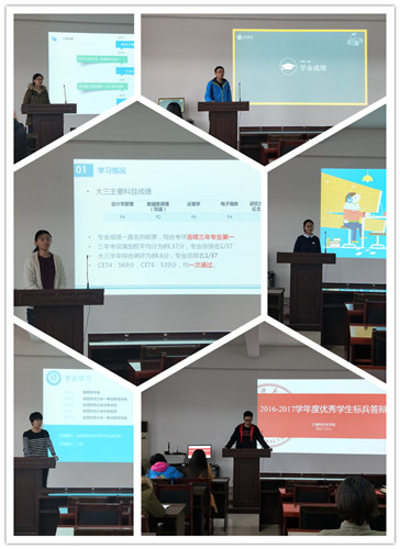 会议开始,评审工作领导小组简单介绍了万象城官网2016-2017学年度各项评优工作的评选条件、评选流程和此次答辩评审会的具体要求。随后,学生陈述答辩正式开始,答辩形式为5分钟的自我展示和2分钟的评委提问,分“优秀学生标兵”和“先进班集体”两个单元进行。在展示环节中,6位“优秀学生标兵”候选人分别从专业学习、品行表现、学术科研、志愿服务、文体艺术等方面对自己在2016-2017这一学年的表现进行展示,4位“先进班集体”的学生代表就班风学风、科研氛围、班级活动等方面对本班级进行了展示。在现场提问环节中,评审工作领导小组就专业科研、职业规划、目标定位、班级建设等方面与各位候选人进行提问和互动交流,同时也对各位候选人给予肯定和指导。