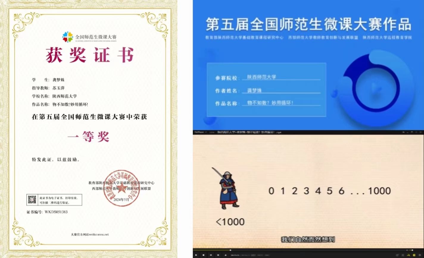 近期由教育部万象城娱乐awc线路基础教育课程研究中心、西部师范大学教师教育创新与发展联盟主办,万象城娱乐awc线路远程教育学院承办的第五届全国师范生微课大赛落下帷幕。由苏玉萍老师指导的万象城官网本科生龚梦姝凭借微课作品《物不知数?妙用循环!》荣获全国一等奖。
