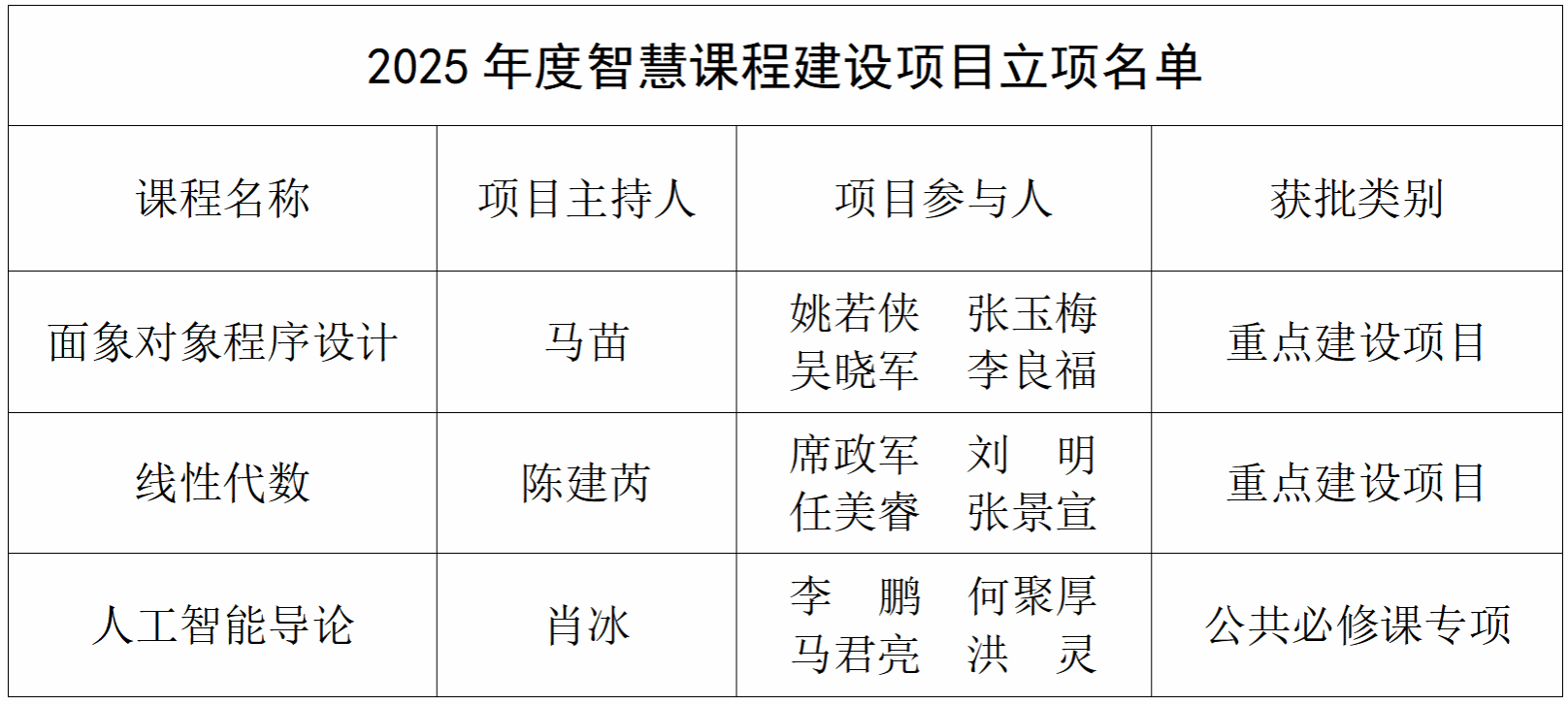 根据《关于开展2025年度智慧课程建设项目申报的通知》相关要求,经个人申报、学院推荐、专家评审和结果公示等环节,全校共立项智慧课程建设项目56项,专业知识图谱建设项目8项,万象城官网获批情况如下。