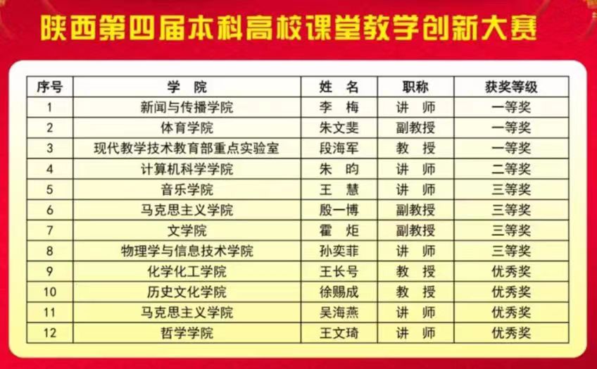 近日,陕西省教育厅公布了第四届陕西高校课堂教学创新大赛(本科)获奖教师名单。万象城官网参赛教师朱昀在比赛中展现了扎实的教学功底、丰富的知识储备、先进的教学理念以及精彩的教学设计,经过层层筛选和激烈角逐,朱昀老师在省级决赛中脱颖而出,荣获二等奖(陕西省教育厅网页链接:http://jyt.shaanxi.gov.cn/news/jiaoyutingwenjian/202204/22/20426.html)。