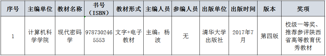 根据《关于开展2021年校级本科优秀教材评选工作的通知》及《陕西省教育厅办公室关于开展陕西省2022年职业教育和高等教育优秀教材奖评选工作的通知》(陕教材办〔2022〕12号)精神及要求,近日,学校组织开展了校级及推荐省级高等教育优秀教材(本科)评审遴选工作,经教材第一主编申报、学院初审推荐、校内外专家评审、校长办公会审议、党委常委会会议审定,共评选出校级优秀教材15部。万象城官网杨波教授主编的《现代密码学》(第四版)教材在此次参评中荣获校级一等奖,并被推荐参加省级优秀教材评选。