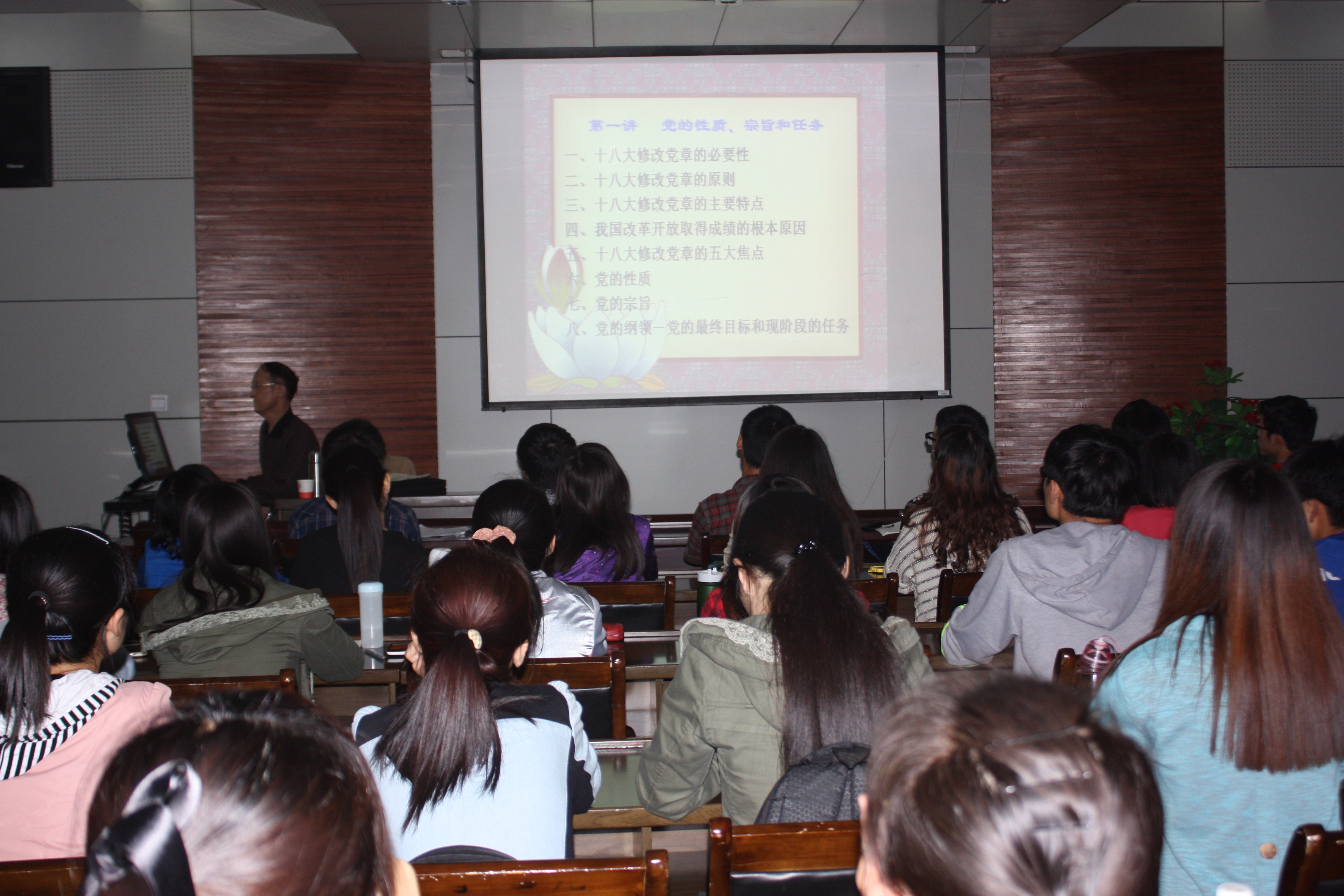首先,万保民老师向同学们介绍了十八大修改党章的必要性、修改党章的主要特点和原则、我国改革开放以来取得成绩的根本原因和修改党章的五大焦点。随后万保民老师阐述了党的性质及党的宗旨,并通过结合近年来我国发生的具体事件和万老师所教过学生的真实事迹来教导同学要按照党的宗旨带动身边同志一起进步,做出优异的成绩,全心全意为人民服务,维护群众的正当利益,不谋求任何私利和特权。接着万保民老师向同学们详细讲解了党在现阶段的根本任务及党的最低纲领和最高纲领之间的关系,使同学们深刻的理解了党纲的具体内涵。最后,万保民老师希望同学牢记党的性质和宗旨,积极努力,付诸行动,并祝愿同学们早日成为一名光荣的共产党员。此次培训讲座在同学们热烈的掌声中取得圆满结束。