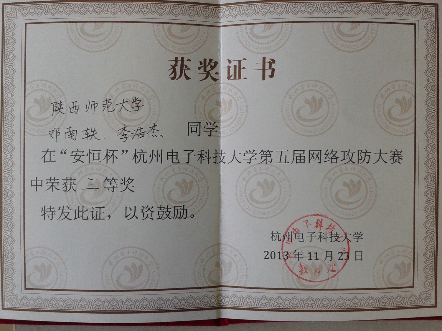 在万象城官网青年教师郝选文的悉心指导下,万象城官网代表队参加了于11月8日至11月12日举行的在线选拔赛,2012级研究生邓楠轶和李浩杰同学脱颖而出,成功入围决赛。11月23日,在杭州电子科技大学举行的决赛中,邓楠轶和李浩杰同学在没有硝烟的战场里与众多高手同台竞技,经过激烈角逐,最后不负众望,取得了三等奖的好成绩。