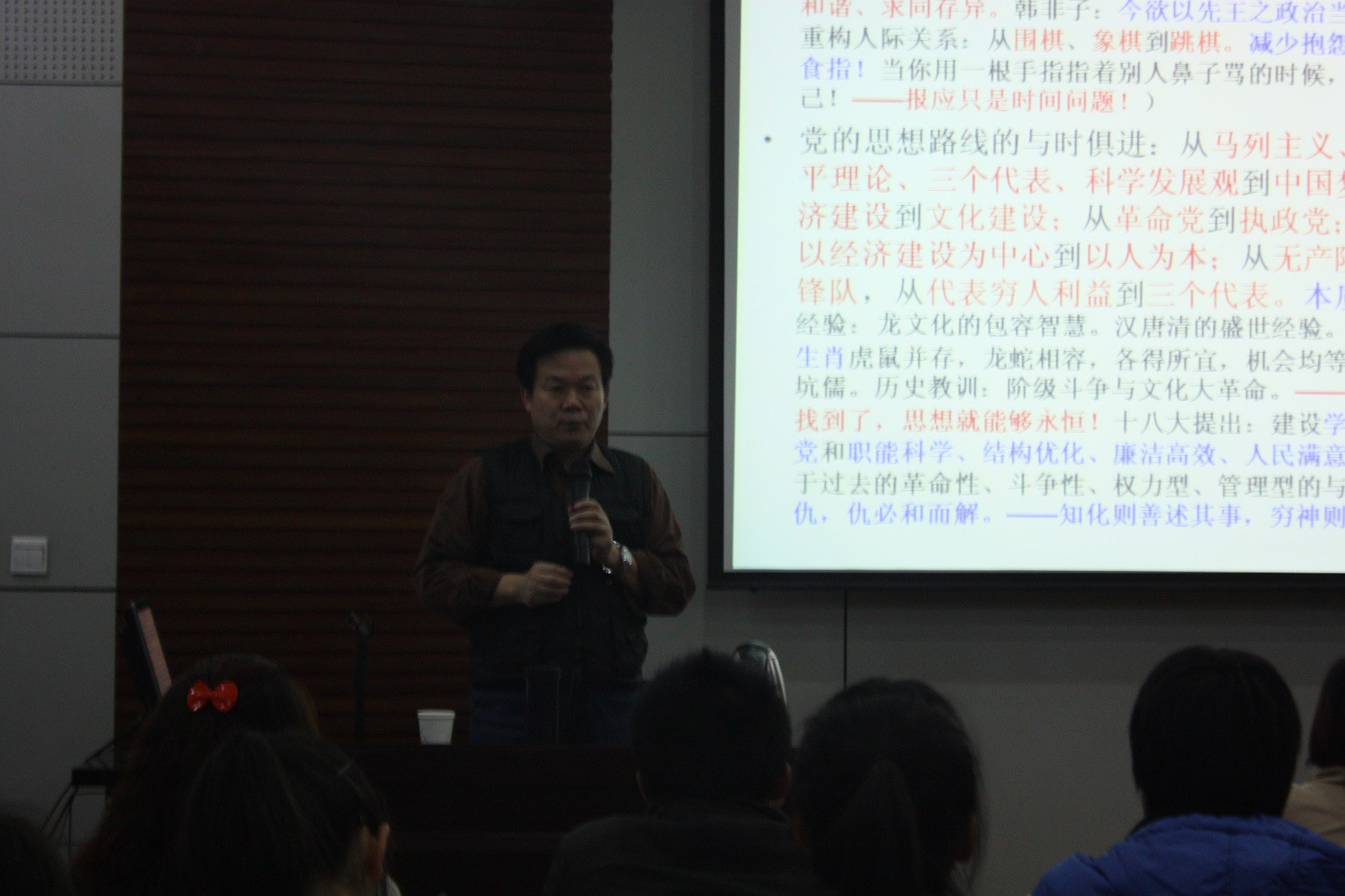 2013年11月12日晚,万象城官网在万象城娱乐awc线路报告厅顺利举行了第二十期党课培训第二讲。图书馆党总支书记、副馆长马晓雄老师以“从‘科学发展观’到‘中国梦’——与祖国和时代一起成长”为主题进行了精彩的报告。