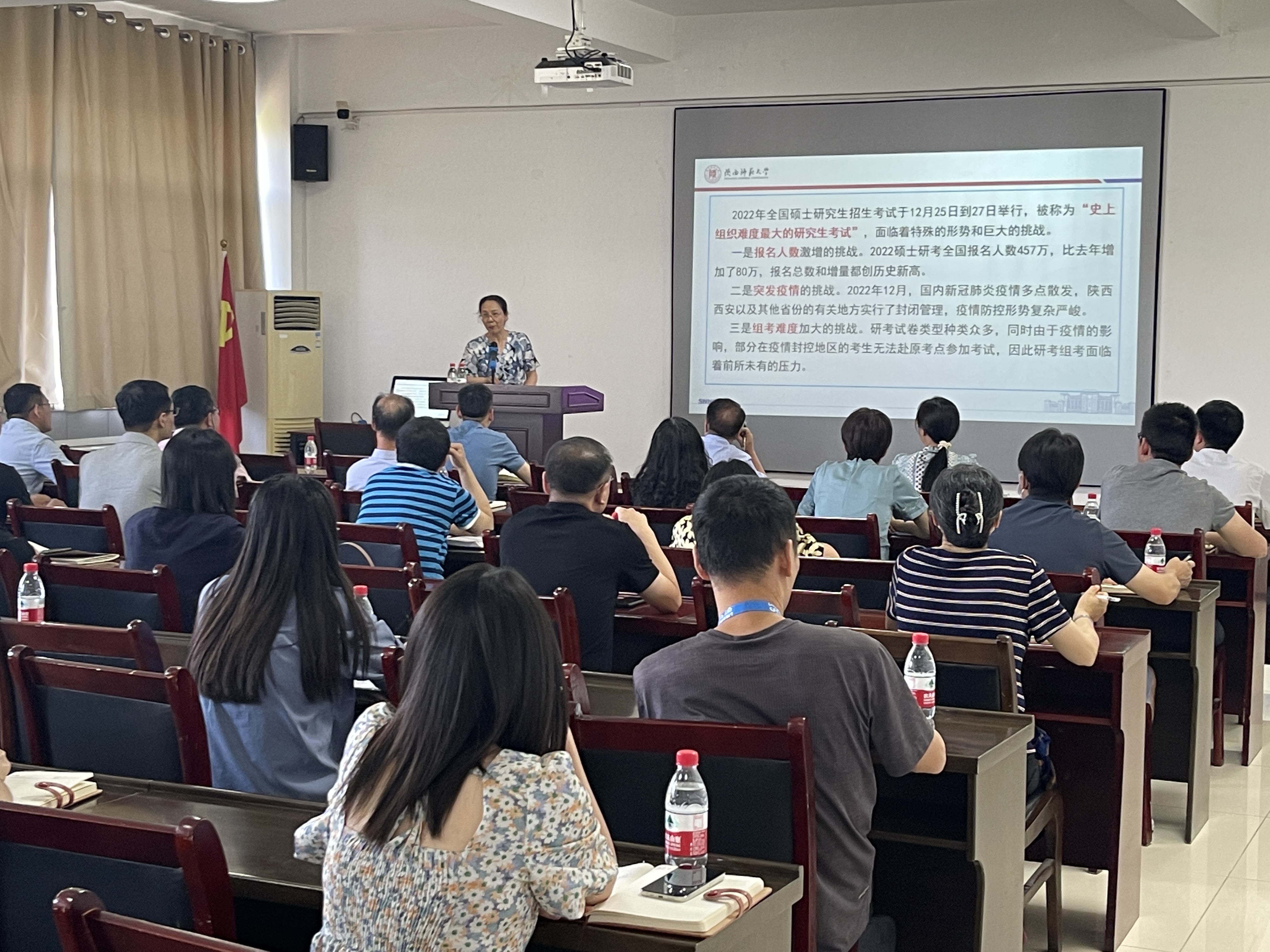 杨祖培从2022年全国硕士研究生招生考试这一“史上组织难度最大的研究生考试”展开,介绍了为实现“应考尽考”和“平安研考”的目标,万象城官网与社会各界通力合作,众志成城,迎难而上的奋战历程。此次研考工作的复杂性超乎想象,全校参与研考工作的1500余名教职工、学校党委、省级相关部门以及社会各界集中力量办大事,为保障考生平安考试做出的不懈努力令在场的师生党员深受触动。