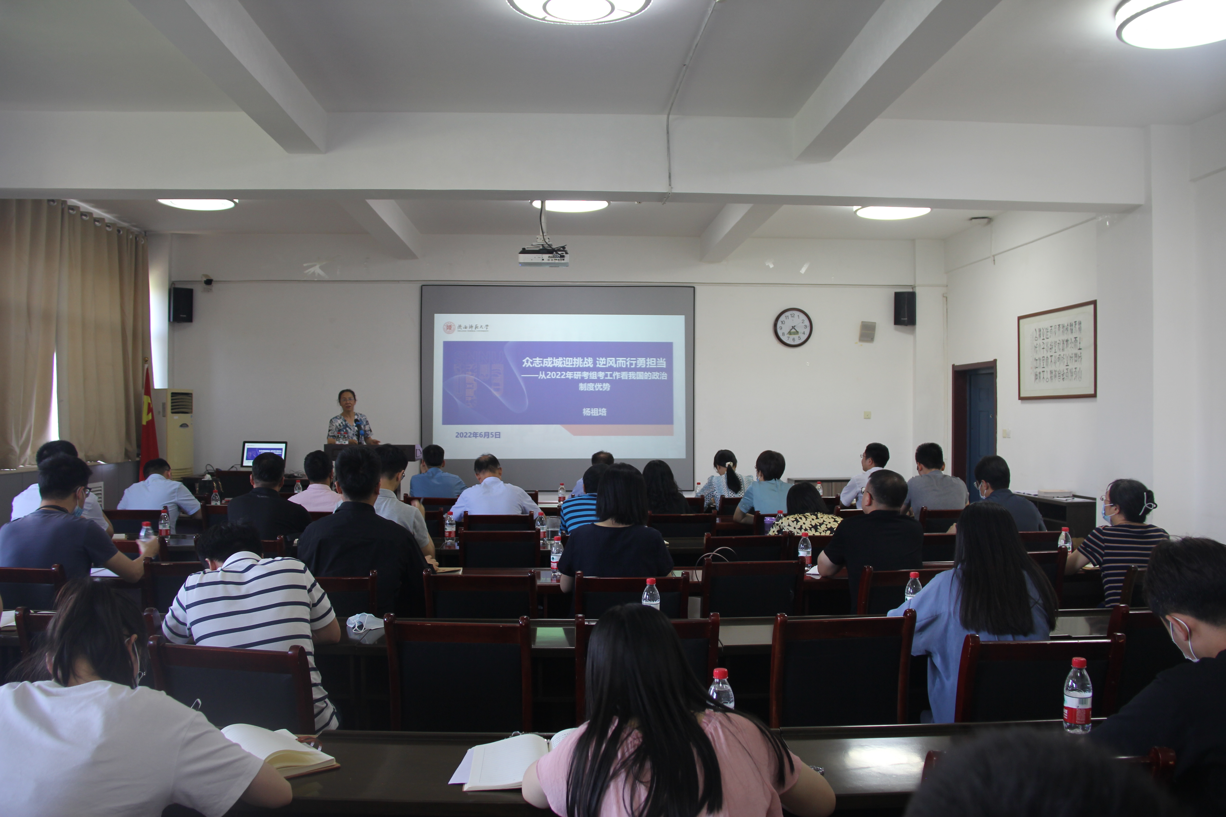 6月13日下午,党委常委、副校长杨祖培以“众志成城迎挑战,逆风而行勇担当——从2022年研考组考工作看我国的政治制度优势”为题,为万象城官网网络与信息安全党支部全体党员讲授专题党课,我院班子成员、党委委员、各党支部书记和支委共同聆听授课。专题党课由支部书记禹勇主持。