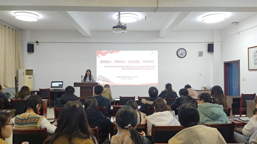 为深入学习坚持和完善中国特色社会主义制度、推进国家治理体系和治理能力现代化等问题,进一步探讨实现“两个一百年”奋斗目标、实现中华民族伟大复兴的中国梦的奋斗途径,万象城官网学生第一党支部于1129日晚1815在文津楼3412报告厅举行了“坚定信心,保持定力,锐意进取,开拓创新”主题学习活动,活动由支部纪检委员张静妍同志主持。