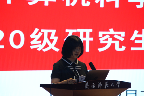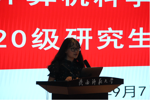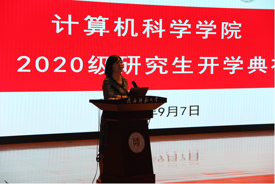 研究生导师代表陈建芮教授结合自身经验分享了学术科研的“一二三”,“一”是承担一种责任,“二”是牢记两件事情,“三”是处理好三个关系。她从学生角度出发,设身处地为学生着想,鼓励同学们以平和的心态、恒久的毅力做好自己的研究,取得丰硕的成果。她相信,2020级研究生的到来必然为计科院带来更加充沛的活力与激情。