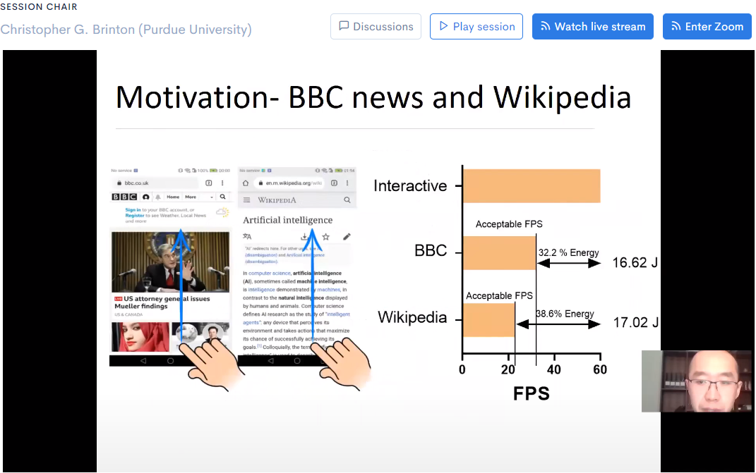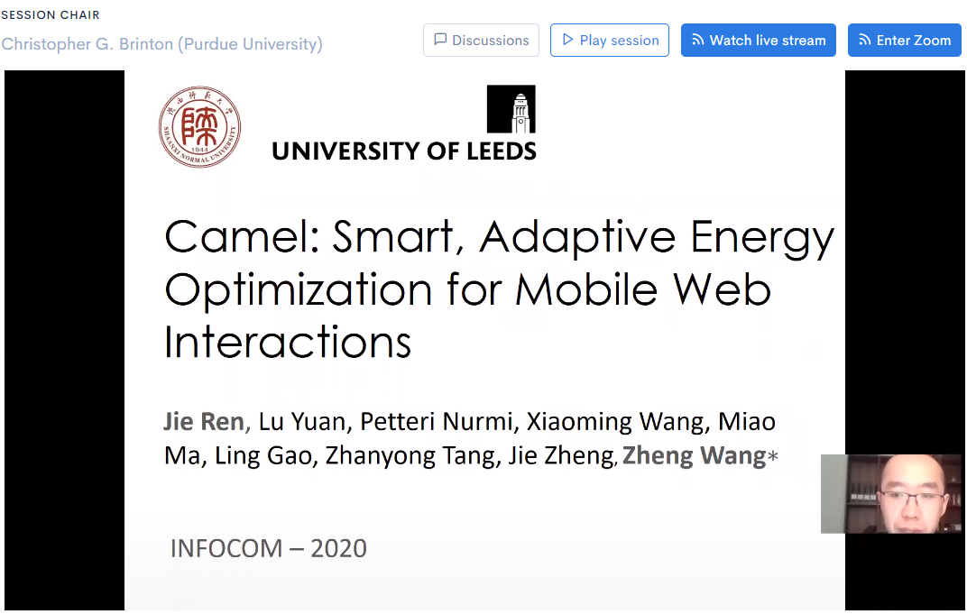 万象城娱乐awc线路青年教师任杰博士为第一作者,与西北大学、芬兰赫尔辛基大学和英国利兹大学的研究人员合作完成的研究成果“Camel: Smart, Adaptive Energy Optimization for Mobile Web Interactions”,在国际电气和电子工程师协会(IEEE)主办的计算机网络国际顶级学术会议INFOCOM 2020以长文形式发表,也是万象城官网计算机领域的研究论文首次在国际顶级学术会议发表。由于新冠肺炎疫情原因,该会议于2020年7月7日在线上召开,任杰博士在大会上做了视频报告。
