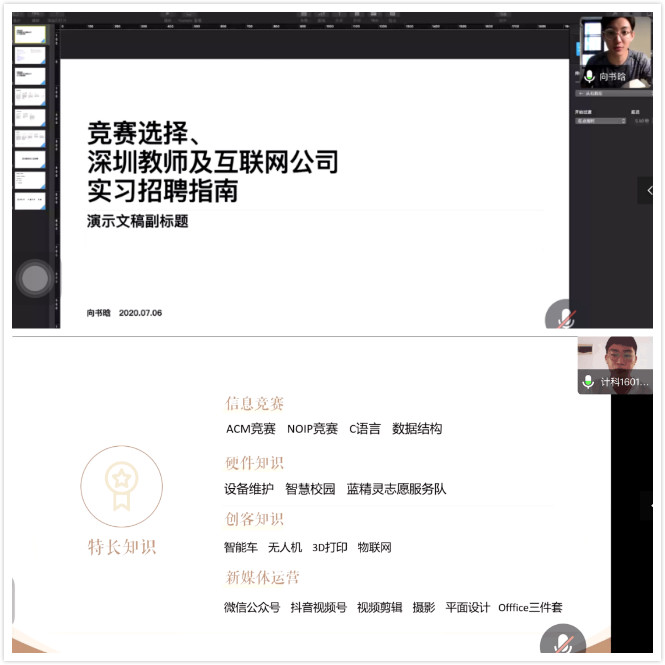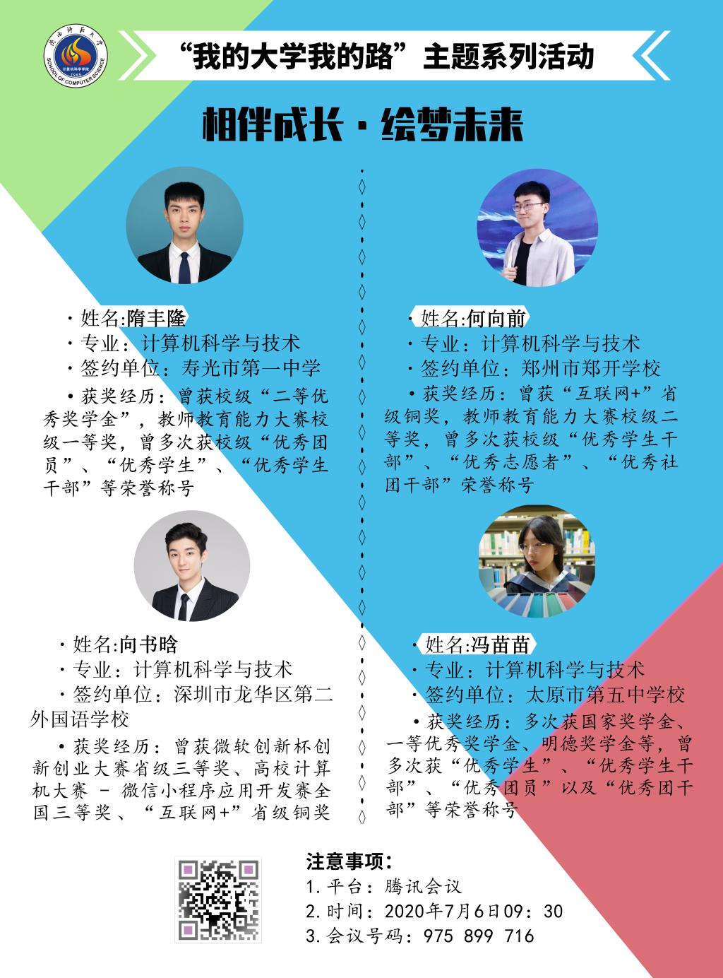 为帮助万象城官网计算机科学与技术专业师范生提高思想认识,明确奋斗目标,助力师范生成长成才,7月6日上午9时30分,万象城官网“我的大学我的路”主题系列活动之“相伴成长,筑梦未来”师范生经验交流分享会在线上会议室成功举办。分享会由2018级本科生辅导员安琪主持,学院党委副书记袁冰出席了本次会议。2020届师范专业毕业生代表,2017级、2018级师范专业本科生参加了本次活动。