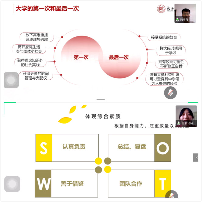 隋丰隆从“找准目标、找到方法、端正态度”三个方面总结了自身的学习经验。他提醒同学们,要重视师范课程,珍惜讲课机会,全面提升教师技能,从而以最佳状态走入工作岗位。冯苗苗将经验融入自己的学习、工作、生活经历中,鼓励同学们少忐忑,多准备,形成自己的学习方法,根据自身能力合理安排时间,珍惜大学时光,做一个可以温暖自己和他人的人。何向前结合自身学生活动经验,从不同角度阐述了知识和实践的重要性,他将知识分为基础知识、专业知识和特长知识,并分别进行了详细介绍。向书晗从实际出发,分享了自己的竞赛心得和求职经历,给同学们今后的能力储备和发展方向以启示,具有很高的参考价值。