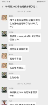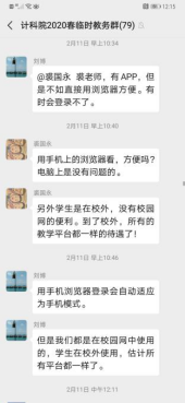 学院组建了临时教务微信群,教学院长、教学秘书第一时间转达学校政策和线上课程的各类信息,专门用于全院老师们关于教学事宜沟通交流,有利于老师们信息查询和相互借鉴,也有利于同学科、同课头老师之间沟通探讨。