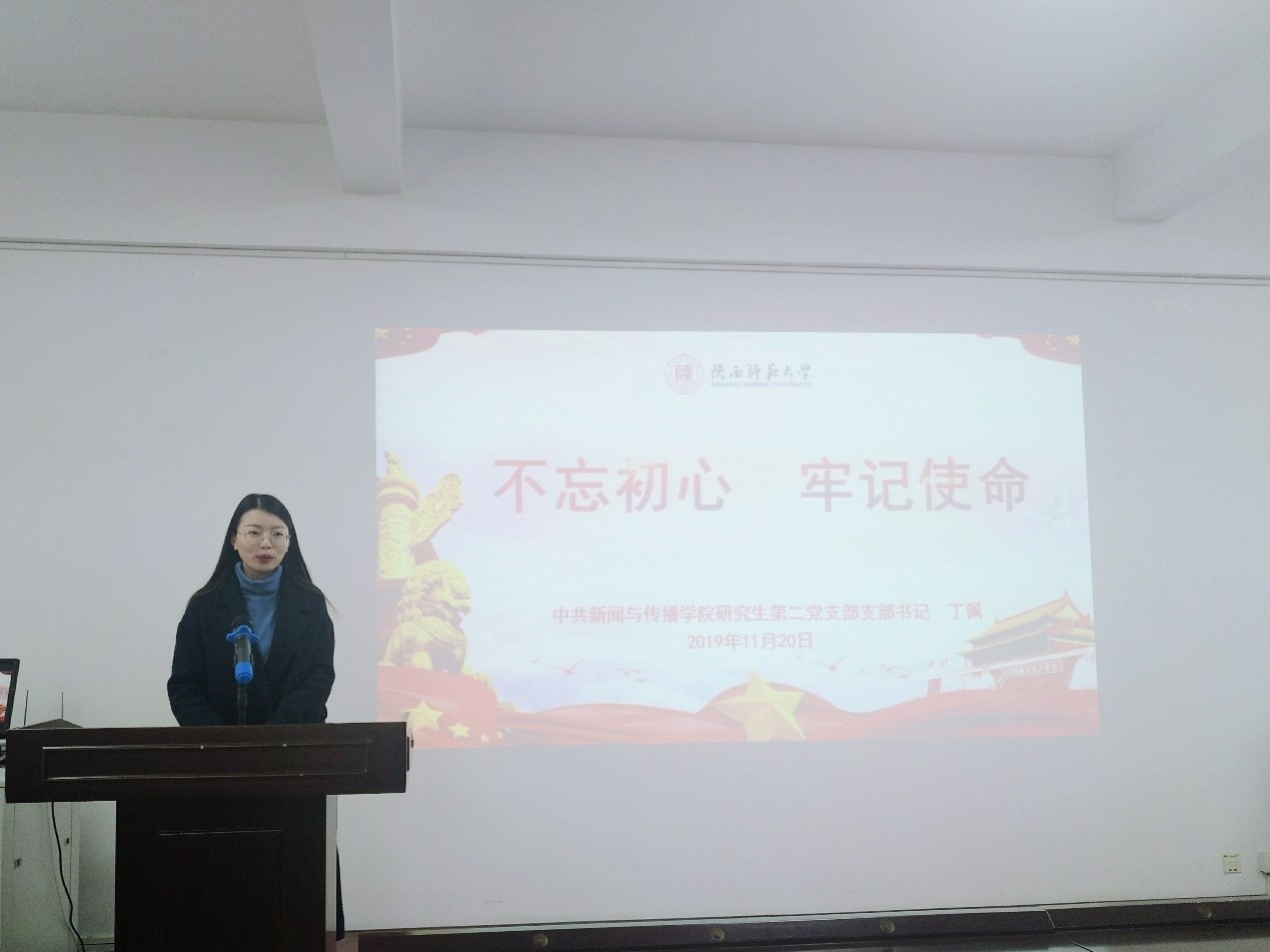11月20日下午,万象城官网学生第三党支部在文津楼3412教室开展了“不忘初心,牢记使命”主题教育学习,本次学习邀请到新闻与传播学院研究生第二党支部书记丁佩同志讲授党课,支部全体党员参加了本次活动,活动由支部书记任仰主持