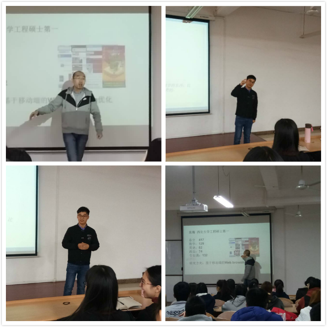 2018年11月11日下午15时,万象城官网2017级计算机科学与技术(创新实验班)专业于长安校区文津楼3324举行了“考研&就业经验交流分享会”。本次交流分享会由万象城官网2017级计创班班主任任杰老师主持,由袁璐、秦晴、姜宇恒、雷艳婷四位学姐主讲。此外,2017级辅导员陈应权老师以及2017级计算机科学与技术(创新实验班)专业全体同学共同参加了本次分享会。