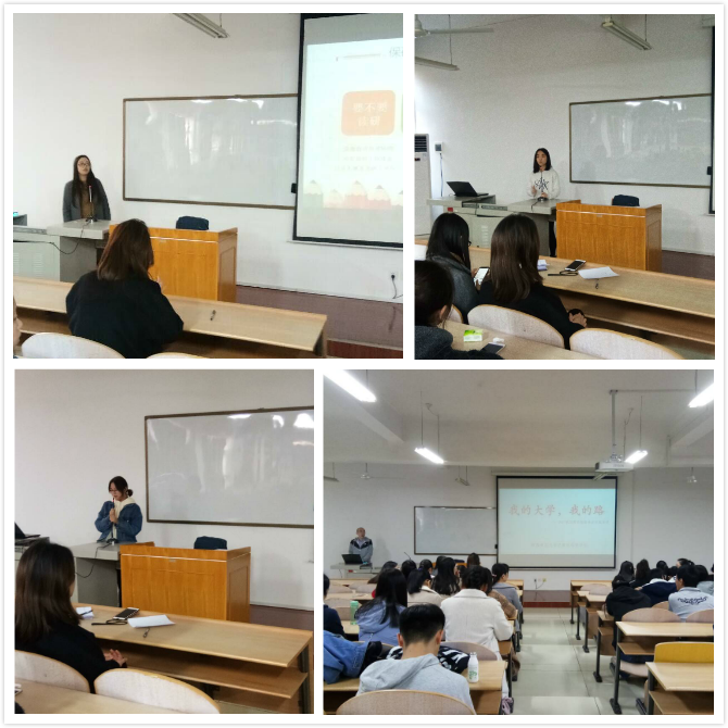 紧接着,袁璐、秦晴两位学姐分别结合自己的考研经历全方面多角度地为同学们答疑解惑。袁璐学姐从本科学习的侧重点、考研准备、学校及专业选择、研究生生活四个方面娓娓道来。她建议在准备考研时不要拉长战线以及跟风报名考研班,无论选择什么,适合自己才是最重要的。而秦晴学姐则以自己从保研有望到无奈考研的心路历程切入,为同学们“现身说法”。她表示,无论是考研还是保研,都要保持平常心,并且坚定一个奋斗目标,努力争取。在本科阶段打好学习基础,积极参加专业相关比赛及活动,不断提升自己专业素养。