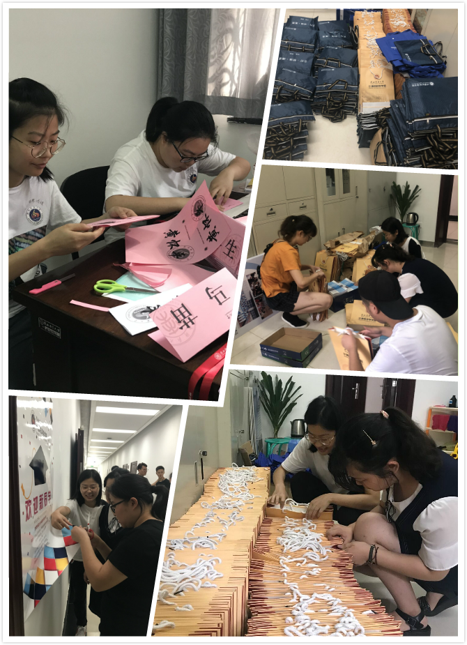学院迎新工作小组精心准备,真正做到以心迎新,并召开协调会,精心部署,全局规划,以确保迎新工作高效顺利地进行。经过选拔和认真培训后的志愿者们,牺牲暑假时间,提前返校,全方位进行迎新准备工作。志愿者们一丝不苟地印发装订《我们的家风故事》等迎新材料,精心设计文化展板,仔细张贴文化海报,悉心布置新生宿舍。他们既能肩扛背包、手挑行李,陪伴新生办好报到手续、入住宿舍,也能细致耐心地为新生及家长解答疑问、恳切建议。就是这样一群可爱的人,整装待发,以最好的姿态迎接最青春的2018级新生。