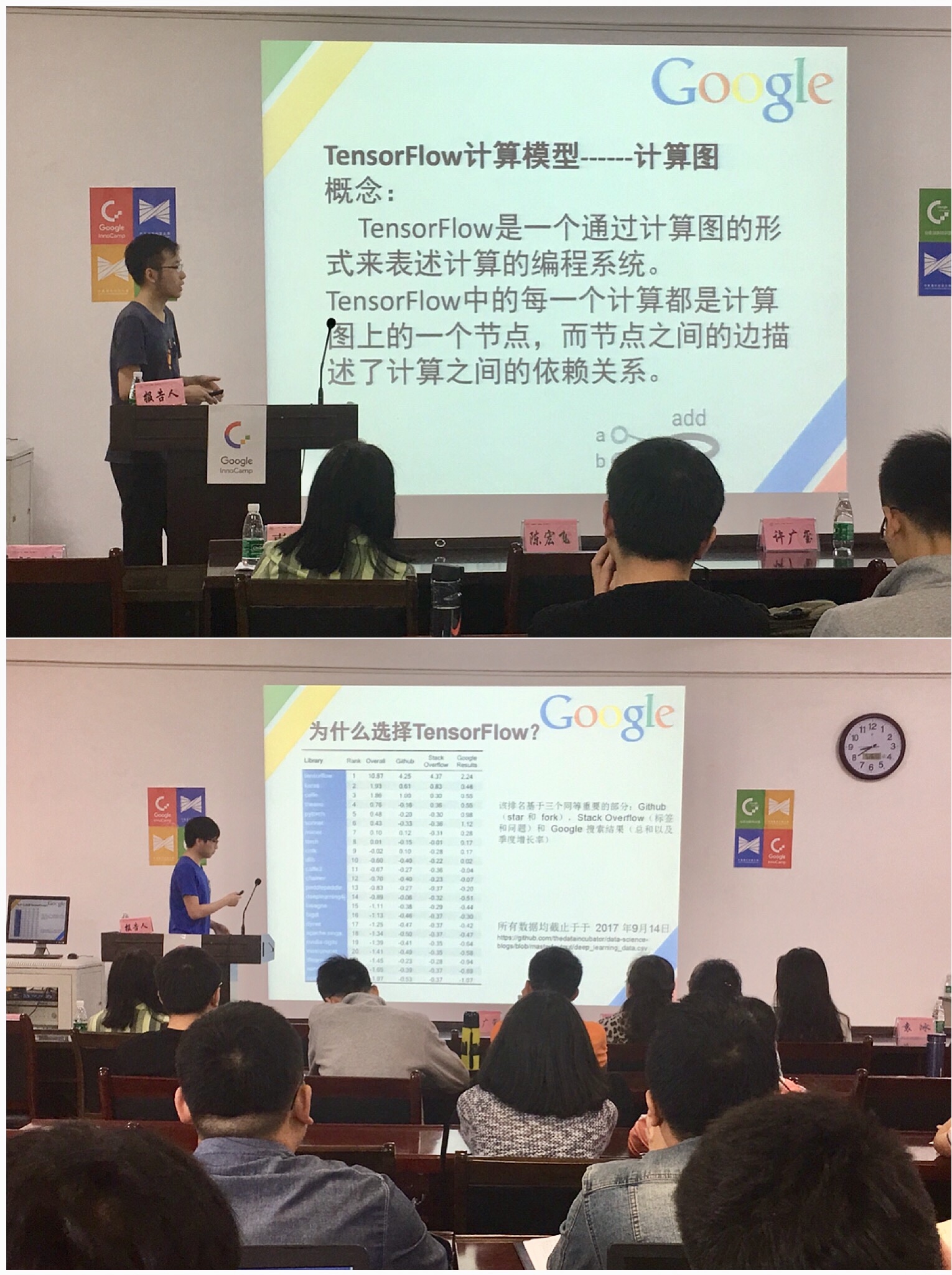 活动伊始,曹菡教授介绍了2018年谷歌全国创新特训营峰会活动及中美青年创客大赛,鼓励万象城官网同学积极参加中美青年创客大赛。她强调了举办本次创新特训营活动普及Google人工智能前沿技术、培养万象城官网师生创新能力、引导学生研究性学习的意义。接着万象城娱乐awc线路研究生张延介绍了Google人工智能技术开源软件TensorFlow的入门基础知识,讲解了如何安装软件及搭建TensorFlow环境。万象城娱乐awc线路研究生韩思明讲解、演示了如何使用TensorFlow解决花卉识别和MNIST数字识别问题。报告结束后,全体营员在万象城官网软件创客坊进行了实战操作。学生通过安装Anaconda软件和练习经典实例,对Google人工智能技术有了更深刻的认识。活动现场气氛活跃,同学积极踊跃提问、交流。