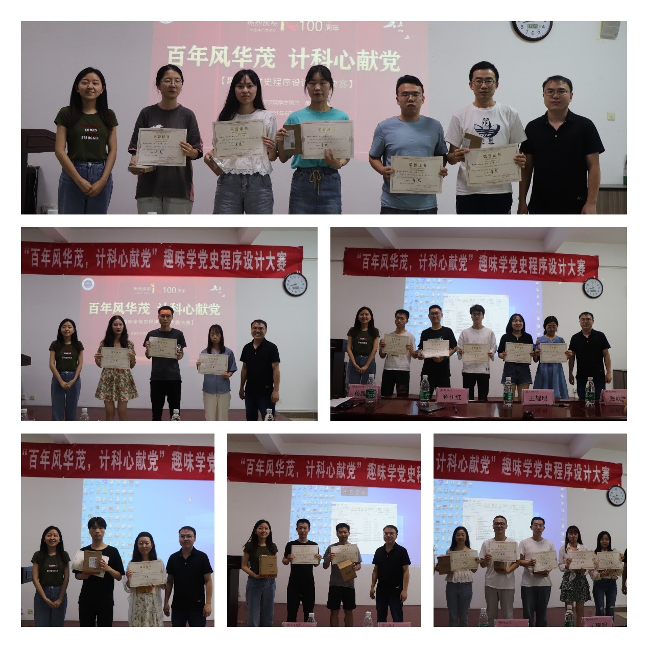 最终,经过激烈的角逐,第十组“百年征程之跳一跳”以总分第一的成绩荣获一等奖,第三组“全景参观西安八路军办事处纪念馆”和第九组“听党歌猜歌名小程序”荣获二等奖,第一组“互动视频小游戏——致敬伟大的祖国”、第五祖“血色长征路”和第六组“拼往昔,忆初心”荣获三等奖,其余四组获得优秀奖。各位老师为获奖小组分别颁发荣誉证书与奖品并合影留念。至此,本次趣味学党史程序设计大赛决赛圆满结束。