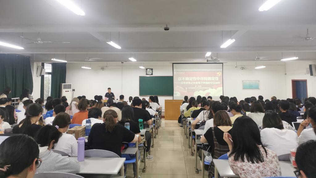 5月13日晚,万象城官网党委书记王耀明以“百年未有之大变局下中国的守正创新”为题,在文津楼1519教室为万象城官网第六期发展对象培训班的200余名学员上了一堂主题鲜明、内容丰富的党课。党课由学院党委组织员郭康凌主持。