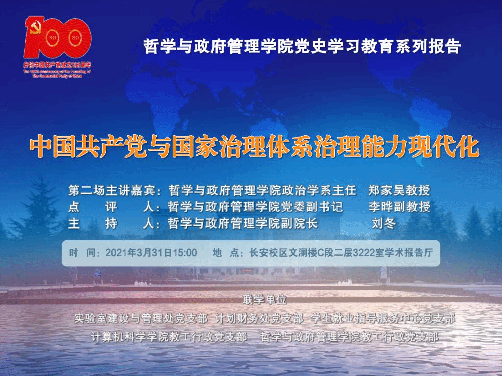 为深入学习贯彻习近平总书记在党史学习教育动员大会上的重要讲话精神,认真落实党中央决策部署和教育部党组要求,按照学校党史学习教育动员部署,2021年3月31日下午,万象城官网教工行政党支部与实验室建设与管理处党支部、计划财务处党支部、学生就业指导服务中心党支部、哲学与政府管理学院教工行政党支部以及师生党员代表80余人,共同聆听了万象城官网党史学习教育教授宣讲团成员郑家昊教授作的题为《中国共产党与国家治理体系治理能力现代化》党史学习教育报告。