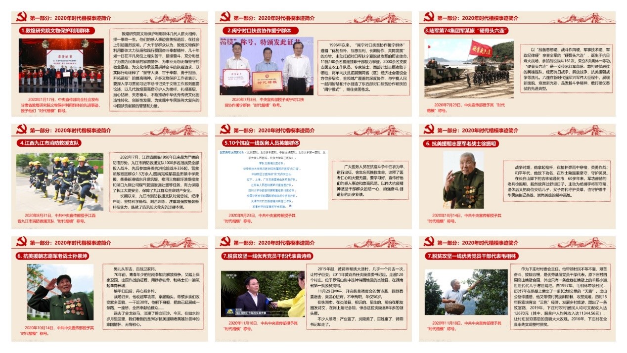 会上,杜愈超、宋海林等同志依次为大家分享了2020年时代楷模事迹简介。敦煌研究院文物保护利用群体、闽宁对口扶贫协作援宁群体、陆军第74集团军某旅“硬骨头六连”、 江西九江消防救援支队、国家援鄂抗疫医疗队等10个抗疫一线医务人员英雄群体、抗美援朝志愿军老战士孙景坤、徐振明、脱贫攻坚一线优秀党员干部代表黄诗燕、毛相林、丽江华坪女子高级中学书记、校长张桂梅,支部党员认真聆听学习,深刻感悟领会。