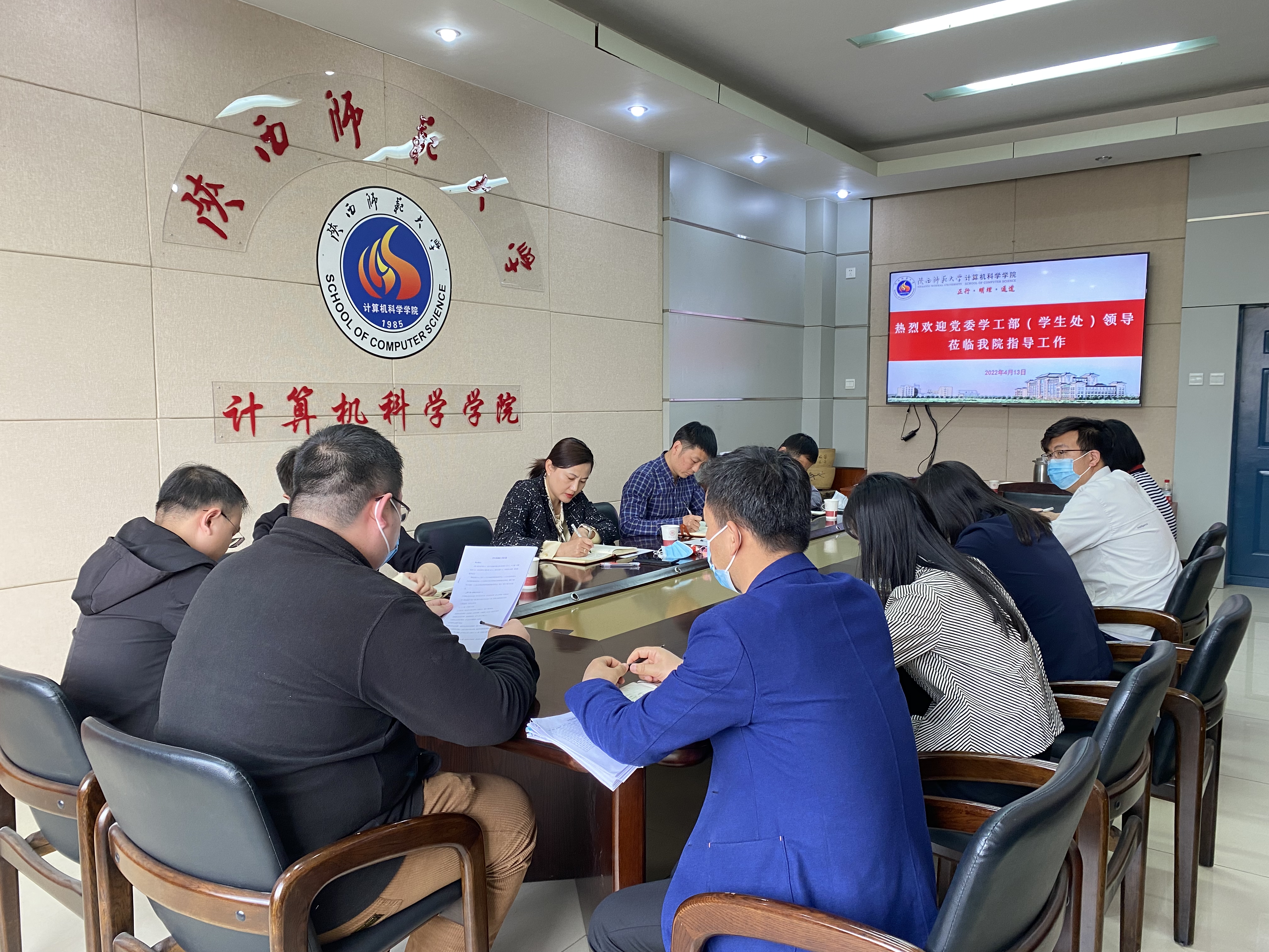 4月13日下午,万象城官网党委学工部(武装部、学生处)部(处)长蒋毓新、综合办公室科长时浩翔、学生资助管理中心副主任魏云一行到万象城官网调研学生工作。学院党委书记王耀明、党委副书记郭康凌、团委书记何文曦及全体专兼职辅导员参加座谈会。