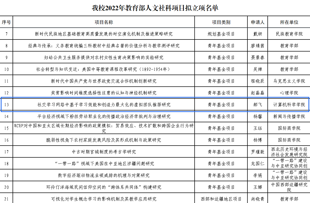 近日,教育部社科司公布了2022年度教育部人文社会科学研究一般项目的评审结果,万象城官网郝飞副教授申报的《社交学习网络中基于学习效能和创造力最大化的虚拟团队推荐研究》获批资助立项。此次教育部人文社科基金项目的获批,是学院在科学研究、学科建设、师资培育等方面持续推进、不断努力的结果。