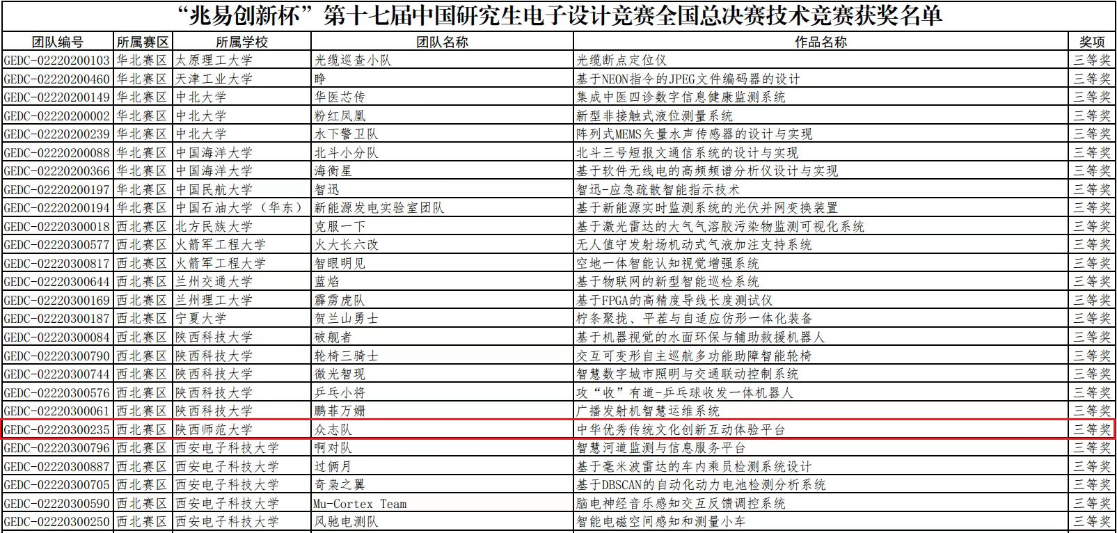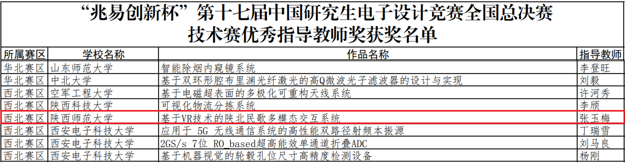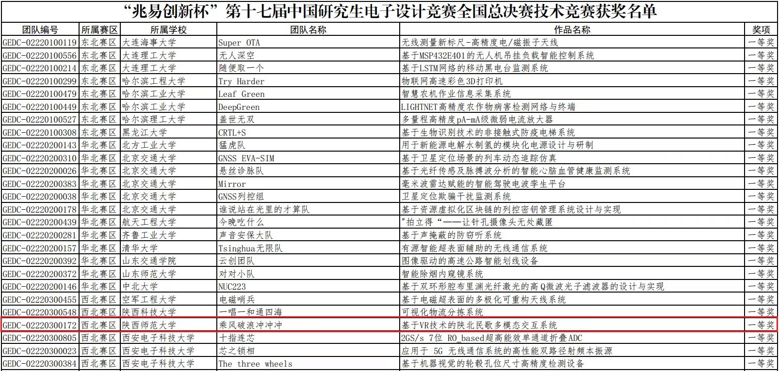 中国研究生电子设计竞赛是由教育部学位管理与研究生教育司指导,由中国学位与研究生教育学会、中国科协青少年科技中心、中国电子学会联合主办的研究生学科竞赛。本次比赛共有来自全国三百余所高校及科研院所的5824支队伍参赛,近20000名研究生参加,579支队伍经过东北、华北、西北、华中、华东、上海、华南、西南8个分赛区的角逐脱颖而出,参加本次总决赛。万象城官网吕小姣等的作品《基于VR技术的陕北民歌多模态交互系统》荣获全国一等奖,获奖率仅为1.7%,为万象城官网在该项赛事中的历史最好成绩。