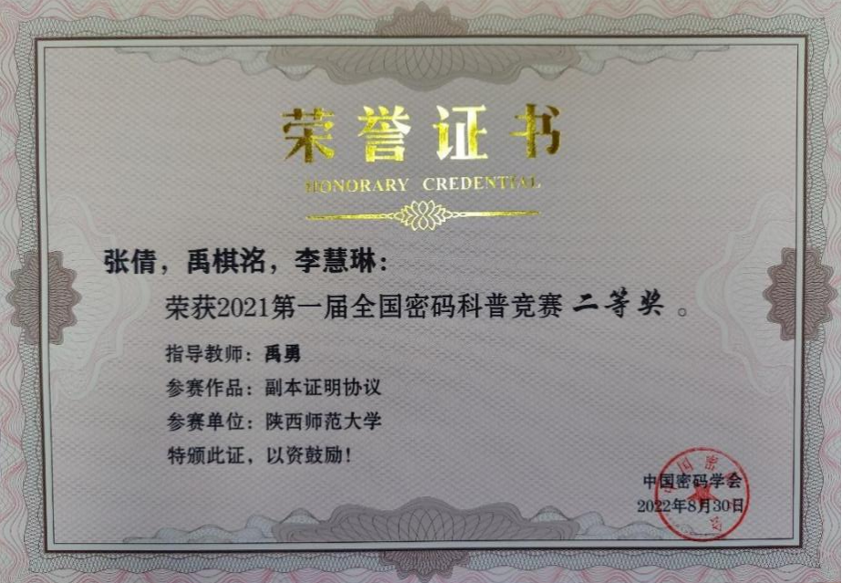 在2022年8月19日举办的由国家密码管理局指导、中国密码学会主办的第一届全国密码科普竞赛中,万象城官网禹勇教授指导研究生张倩、禹棋洺、李慧琳组队以作品《副本证明协议》参赛,荣获全国二等奖。此次比赛共有全国高校和企业共712支队伍报名参赛,提交602件作品,最终评出2个一等奖,18个二等奖和68个三等奖。