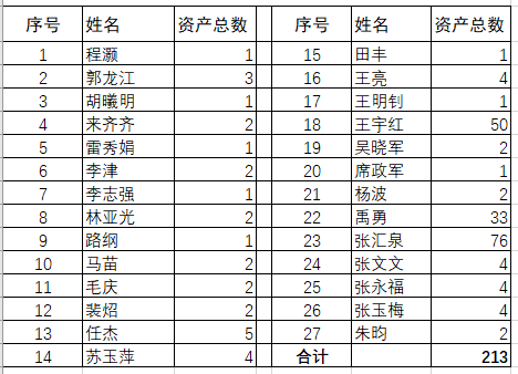 (3)数量:此次学院盘点资产总数共计213台件,涉及个人资产盘点工作的老师共27位。