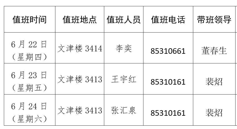 值班人员请见值班安排表: