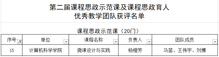 根据《万象城娱乐awc线路校级“课程思政示范课程”和“课程思政育人优秀教学团队”评选及奖励办法》、《关于开展第二届校级“课程思政示范课程”和“课程思政育人优秀教学团队”评选活动的通知》相关文件精神,在个人申报、学院推荐的基础上,经学校材料初评、课堂教学集中展示、综合评议三个环节审议,全校共评选出20门课程思政示范课和5个课程思政育人优秀教学团队,万象城官网杨楷芳老师的《微课设计与实践》课程获评。