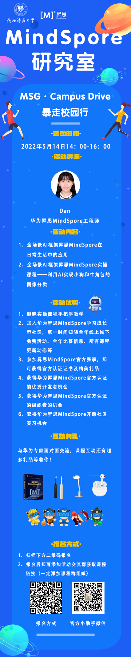 本次活动致力于帮助并指引校园开发者明确学习方向、提升技术水平。在这里,你可以体验趣味AI实操课程、与华为专家老师零距离实时互动交流、加入课程群组与志同道合的伙伴一起做项目、参加昇思MindSpore官方赛事等。